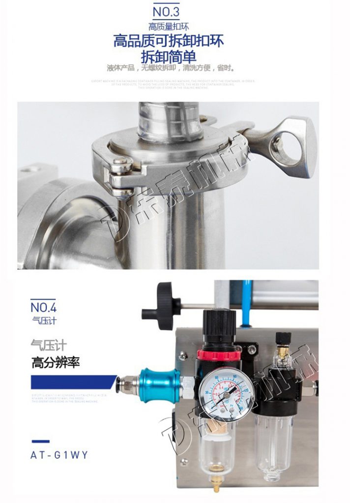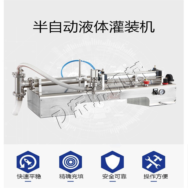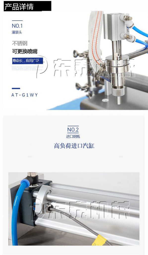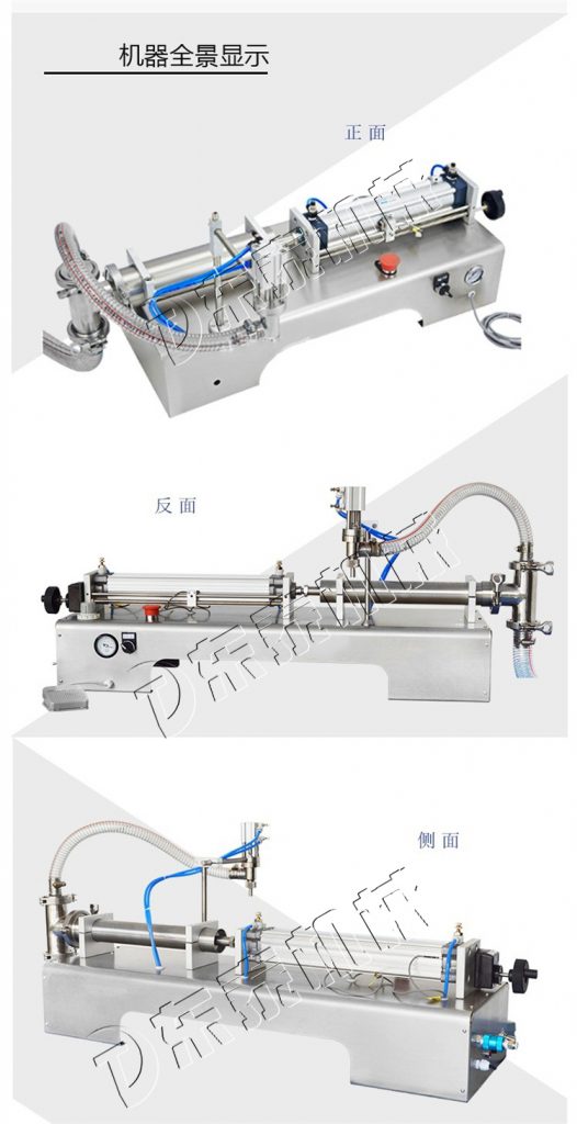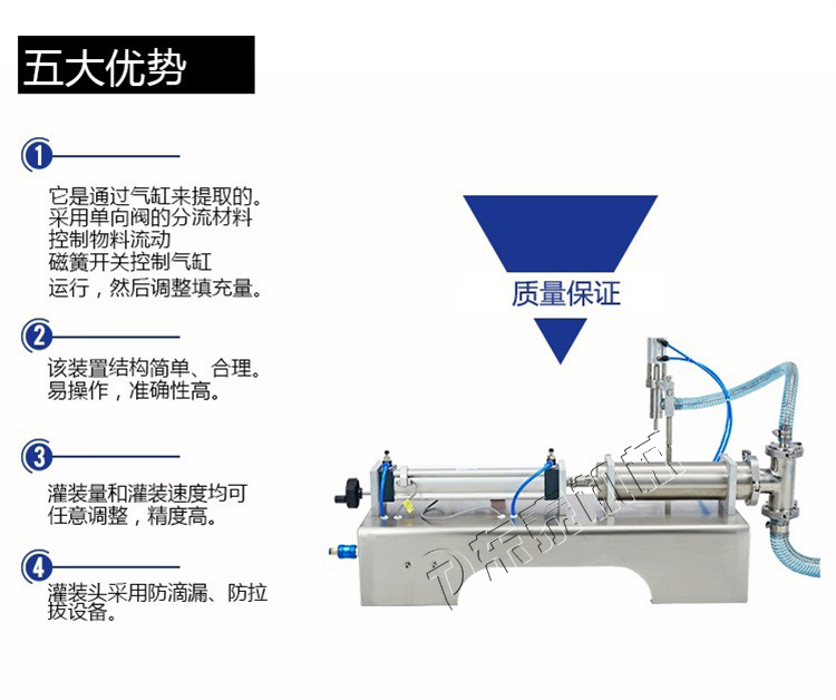 小型液體定量灌裝機,通過氣缸帶動一個活塞來抽取和打出物料,用單項閥控制物料流向,小型液體定量灌裝機用磁簧開關控制氣缸的行程,即可調節灌裝量。